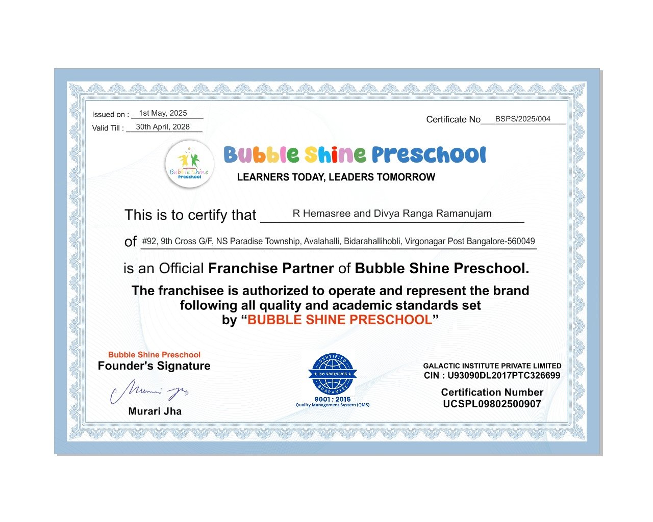 The Avalahalli Branch of Bubble Shine Pre School is a vibrant center of early learning located in the growing education hub of East Bangalore. Operated by dedicated partners Divya R and Hemashree, this branch reflects our core values of care, creativity, and foundational excellence.