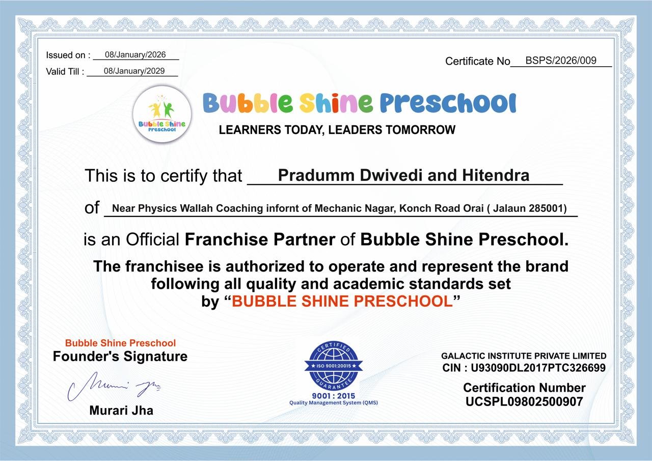 The Orai Branch of Bubble Shine Pre School is a warm and nurturing space for early childhood learning, thoughtfully designed to support young minds in their formative years. This branch embodies our commitment to quality education, creativity, and a caring environment where children feel safe, happy, and encouraged to explore.